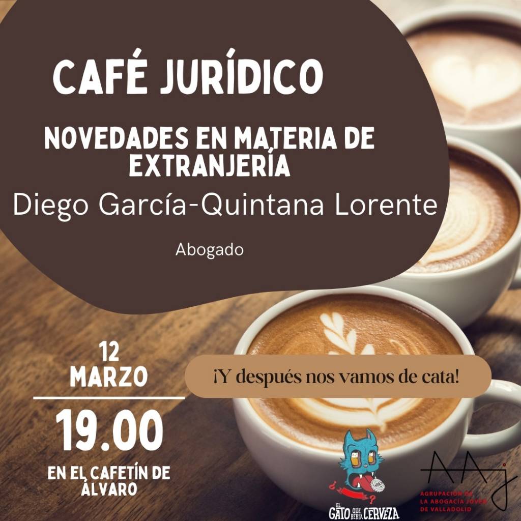 El próximo jueves 12 de marzo, a las 19:00 horas, realizaremos un nuevo CAFÉ JURÍDICO, que tendrá lugar de forma presencial en el Colegio de la Abogacía, en el cafetín de Álvaro. En el que abordaremos las "NOVEDADES EN MATERIA DE EXTRANJERIA", contando para ello con la asistencia de D. Diego García-Quintana Lorente, abogado del Ilustre Colegio de la Abogacía de Valladolid.