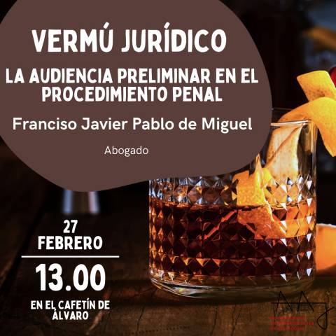 P {margin-top:0;margin-bottom:0;}El viernes, 27 de febrero, a las 13:00 horas, celebraremos un nuevo Vermú Jurídico que tendrá lugar de forma presencial en el Colegio de la Abogacía, en el Cafetín de Álvaro.En esta ocasión, abordaremos "LA AUDIENCIA PRELIMINAR EN EL PROCEDIMIENTO PENAL", de la mano de D. Francisco Javier Pablo y de Miguel, Abogado del Ilustre Colegio de la Abogacía de Valladolid.El vermú tendrá la f...
